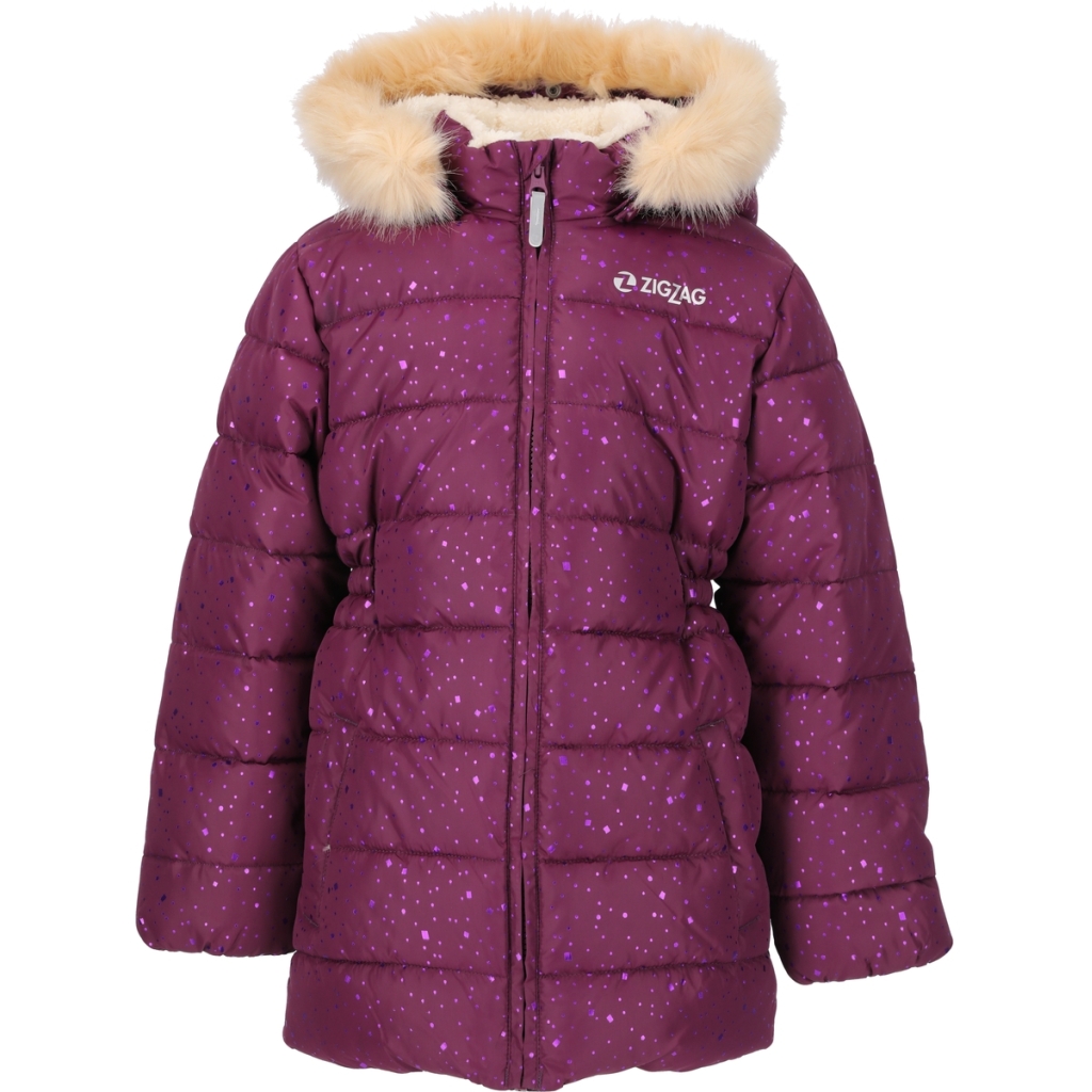 Børne jakke fra ZigZag. Super smart model med "glimmer" i flot farve. Gennemgående lynlås og imiteret pels på hætten.