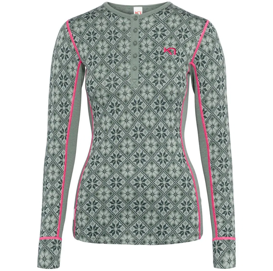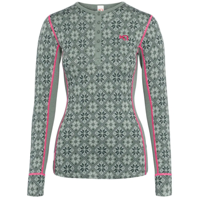 Kari Traa baselayer i 100% Merino uld.Holder dig varm uanset om tøjet er vådt eller tørt, åndbar og hurtigtørrende.Raglan ærmer og flade sømme for super komfort.Flot nordisk-inspireret strik med paneler på undersiden af ærmer, 4-vejs stretch.