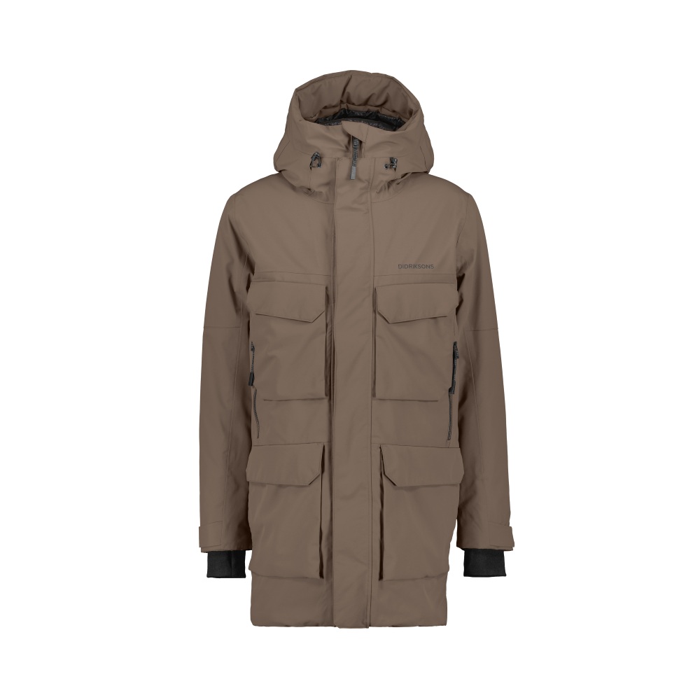Herre vinterjakke. Dejlig varm og med ekstra længde.Fast justerbar hætte, skjult tovejs lynlås, elastiske manchetter med tommelhuller og velcro ved ærmer. Front og bryst lommer alle med knap, yderligere er der også lommer med lynlås ved bryst.Vind og vandtæt med tapede sømme.100% polyester med polyamid linning.